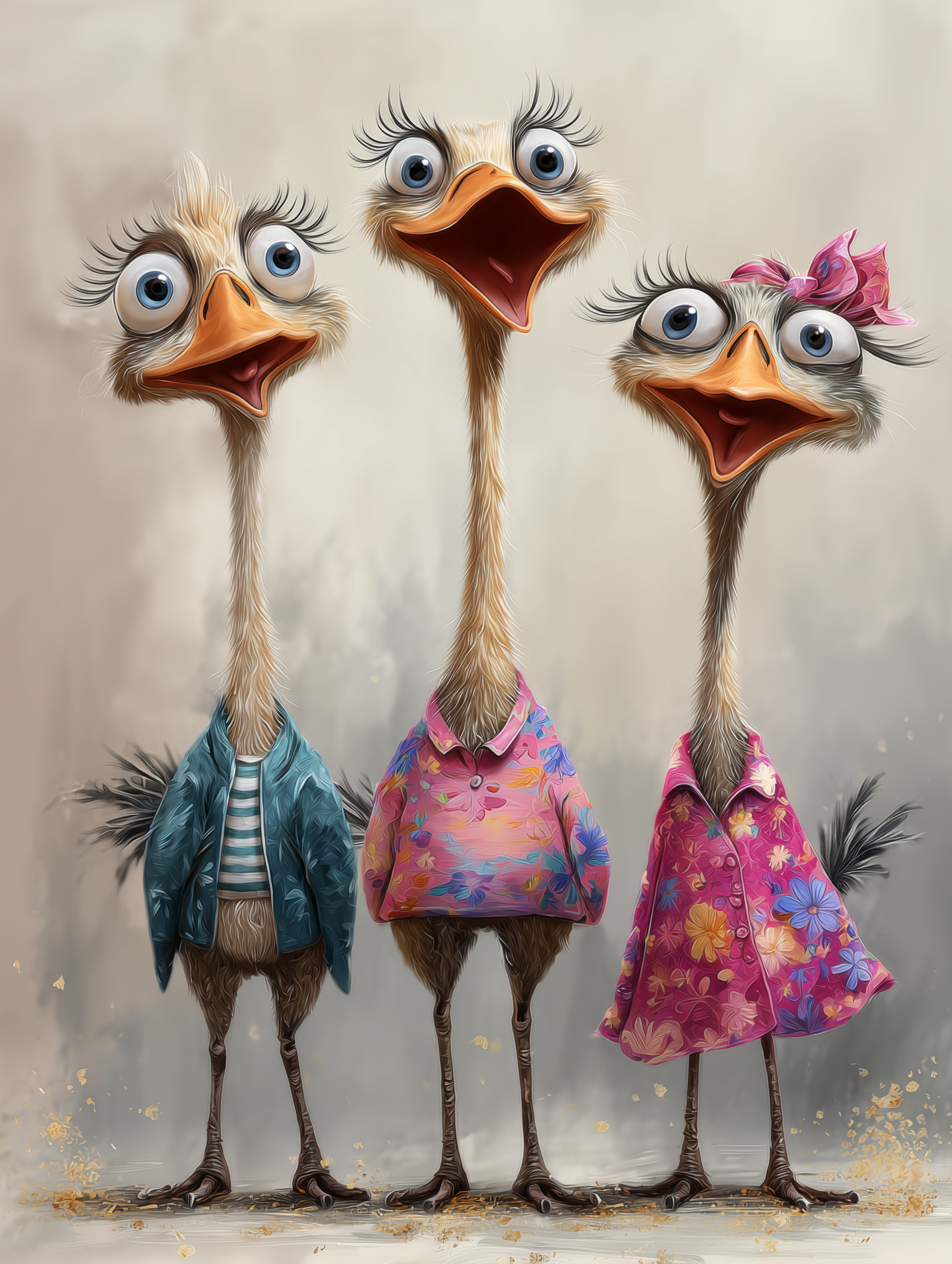 三个身高各异的丑萌漫画鸭子鹦鹉小猫并排站立,细长脖颈仰望着上方,水润长睫毛下镶嵌着樱桃小嘴与翘鼻头,条纹衫、波点裙与碎花裤呈现各异服饰,松散盘发点缀着蝴蝶结、发带与花朵发饰,3D渲染的磨砂白背景中浮现金粉颗粒,夸张的眯眼笑、惊讶张嘴与皱眉表情碰撞出卡通萌趣感,厚涂笔触融合小清新色块。