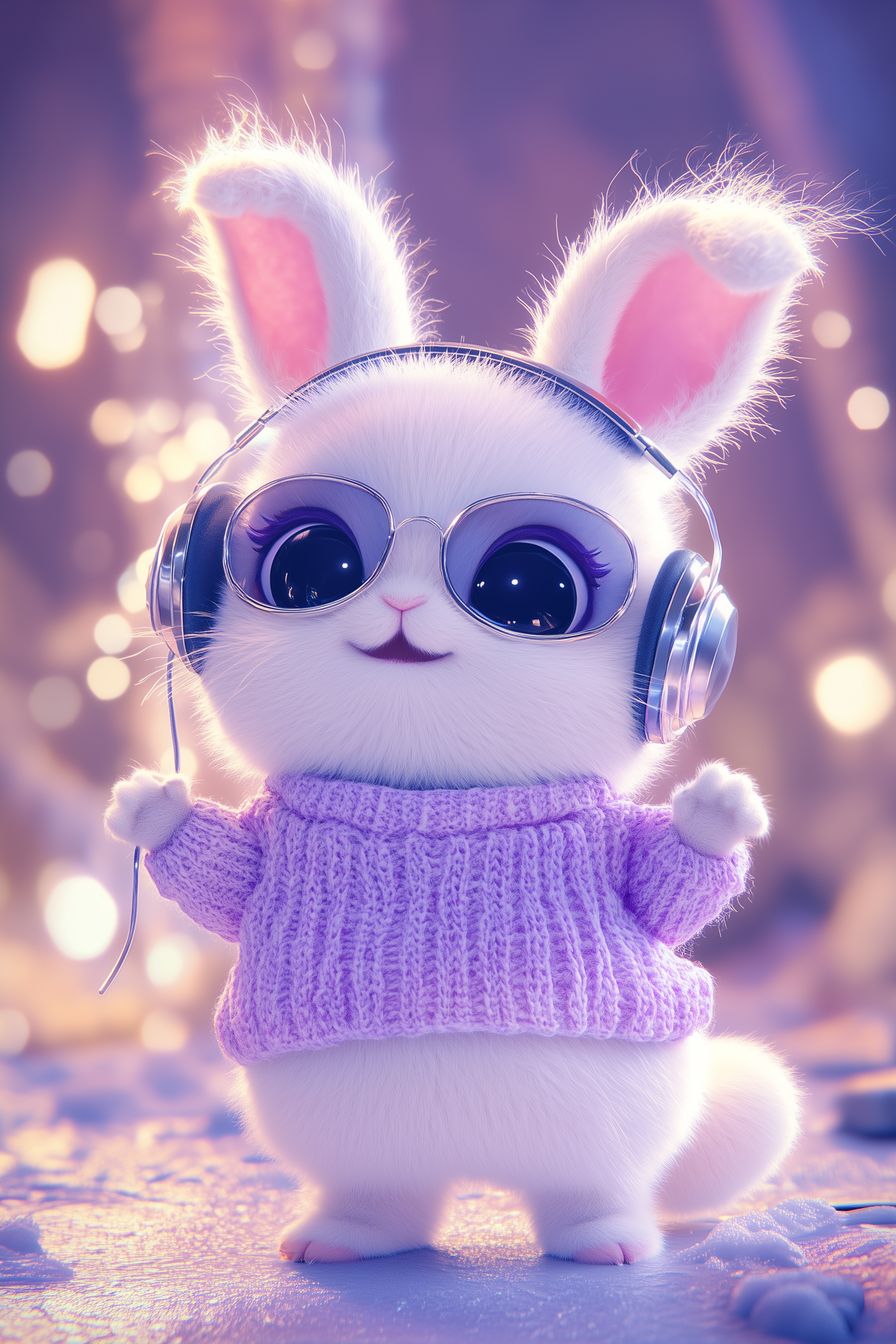一个超级可爱的皮克斯风格的小白兔仙女,戴着耳机又笑又唱又跳,浑身雪白蓬松有光泽,大眼睛明亮,耳朵对称,尾巴毛茸茸,穿着浅紫色毛衣,戴着可爱帽子和银色太阳镜,笑容欢快,精致细腻,充满童话感,细节极其丰富,皮克斯风格,色彩鲜艳,自然光,纯色简洁背景,用5和Octane渲染器渲染,在Artstation(艺术站,一个艺术作品分享平台 )上热门,绚丽华美,超广角,8K,高清写实,8K高清写实