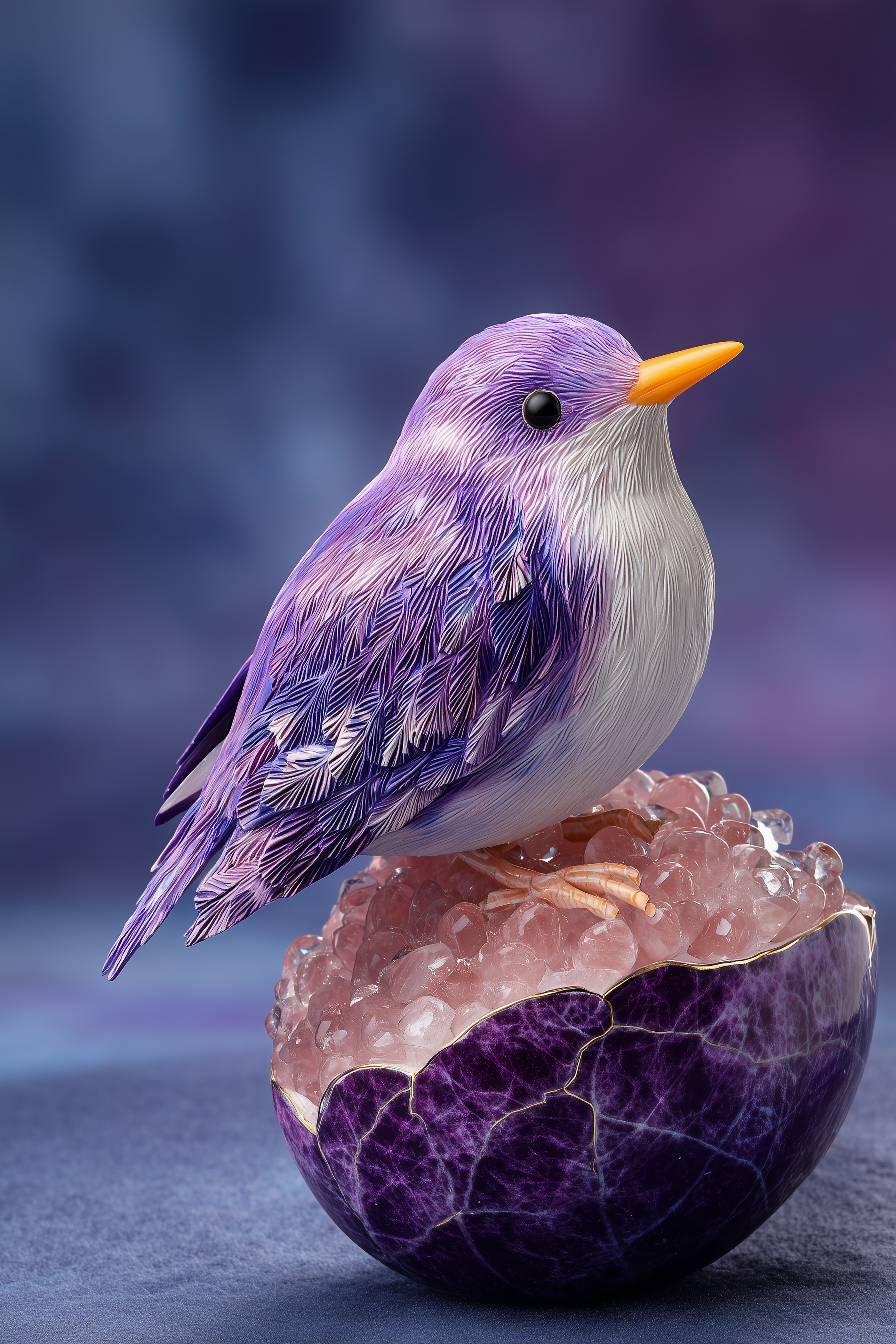 这张图片展示了一只精致的紫色小鸟雕塑,稳稳地栖息在一个被挖空的紫色水果之上。小鸟的羽毛主要为柔和的紫色,腹部则是洁白的颜色,羽毛的纹理细腻逼真,仿佛每一根都经过精心雕琢。它长着一张鲜黄色的喙,黑色的眼睛圆润明亮,显得十分灵动。 水果的外皮呈现出深紫色与白色相间的脉络纹理,如同天然的装饰图案。水果内部果肉为淡粉色,表面附着着晶莹的水珠,仿佛刚刚被清洗过,显得格外新鲜多汁。 背景是柔和的蓝紫色渐变,带有一些模糊的光斑,营造出一种梦幻、唯美的氛围。整个画面色彩搭配和谐,将小鸟的可爱与水果的自然形态巧妙融合,给人一种清新、治愈的视觉感受,仿佛进入了一个童话般的世界。