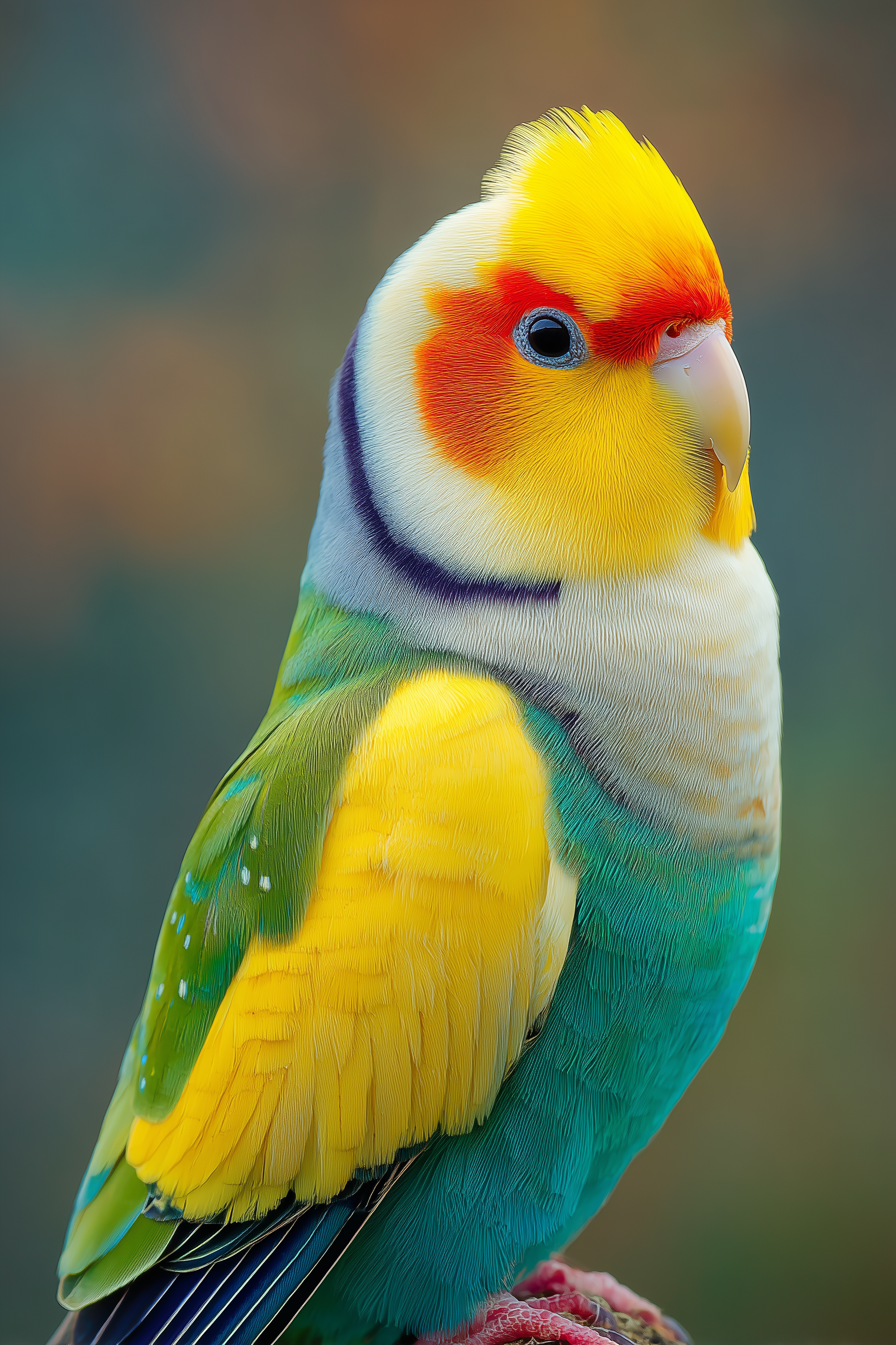 五彩鹦鹉Q版形象,整体色彩绚烂明快,主打可爱漂亮风格:头部羽毛为亮黄色,额间点缀绯红羽斑;眼周环绕钴蓝色短羽(4169E1),虹膜呈现琥珀橙到蜜糖金的渐变(FFA500到FFD700),表层覆盖细碎银星光泽;背部羽毛是翡翠绿(00A86B),边缘晕染孔雀蓝(00CED1);胸腹部位为柔粉色(FFB6C1)基底,缀有靛青色(4B0082)圆点斑;爪子为珊瑚红(FF6F61),喙则是象牙白(F5F5DC)。