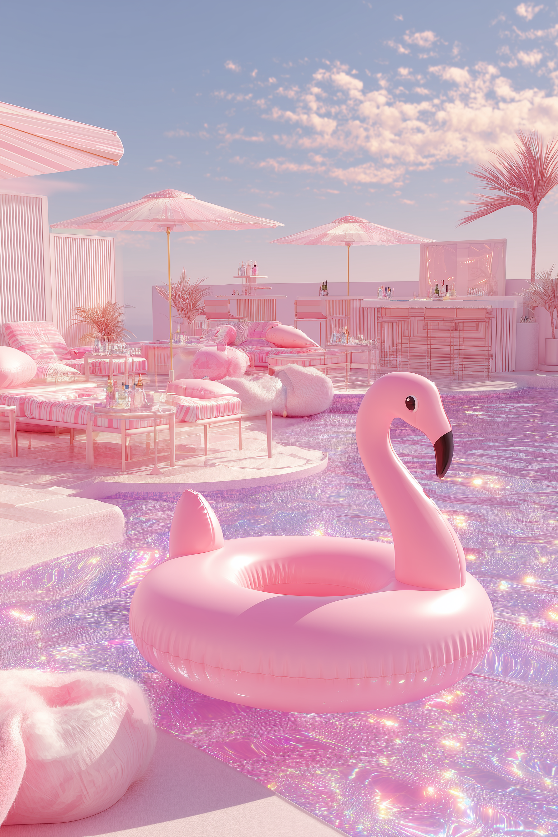 一个明亮和通风的夏日泳池场景与所有柔软的粉红色家具,包括火烈鸟浮动,各种粉红色的游泳池浮动,粉红色的酒吧椅,和躺椅。柔和的粉彩色调,空气和梦幻般的氛围,阳光在水面上闪闪发光,非常柔软的纹理和柔和的灯光,热带夏季的氛围,比例