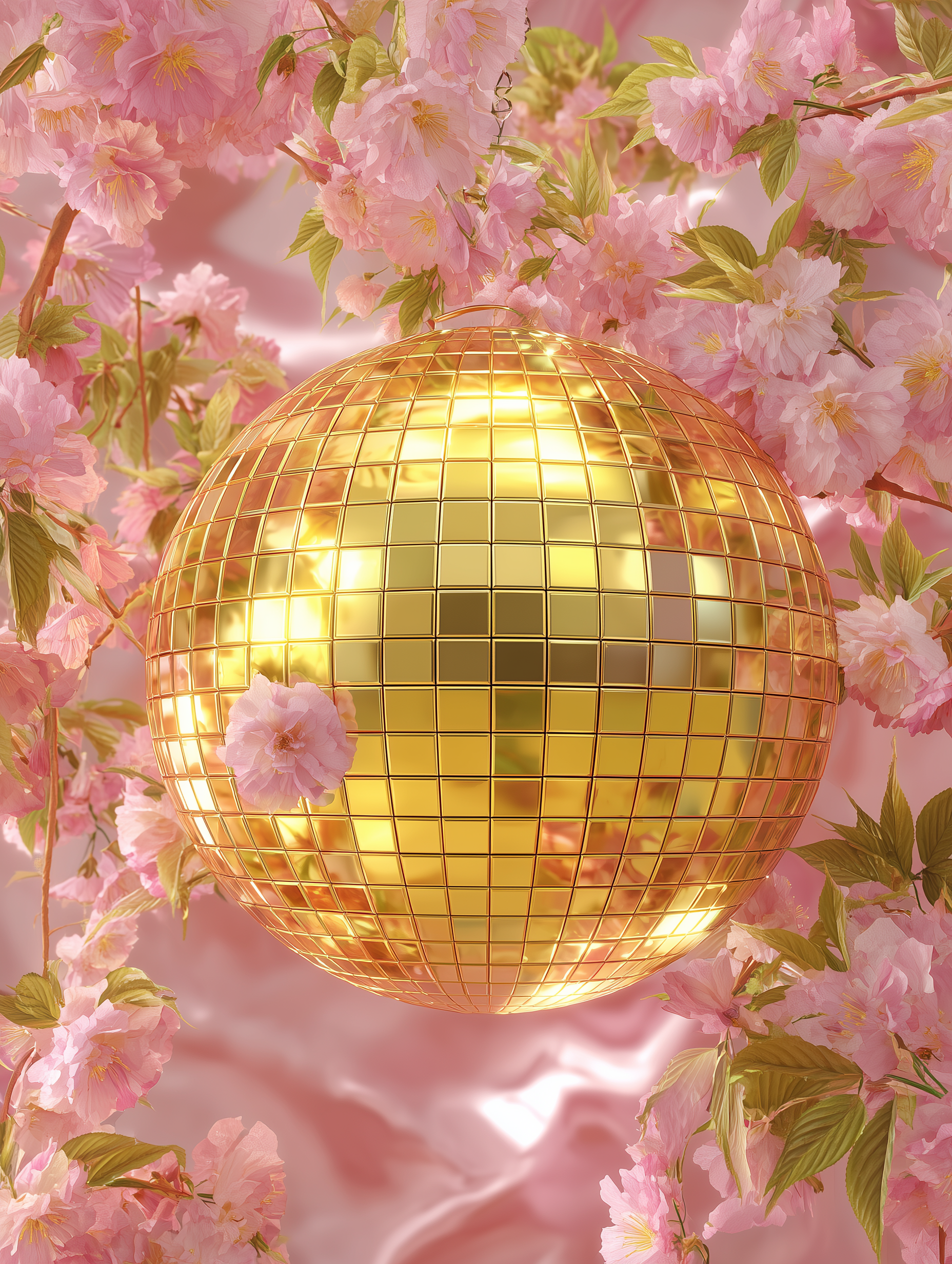 一个柠檬和一个切柠檬的设计看起来像一个迪斯科球,用黄色和金色的镜面瓷砖,微妙的闪光和柔和的反射,最小的闪光效果(不太亮),周围有许多粉红色的花朵与树叶,平静而优雅的气氛,卡通和艺术风格,不切实际,垂直海报组成
