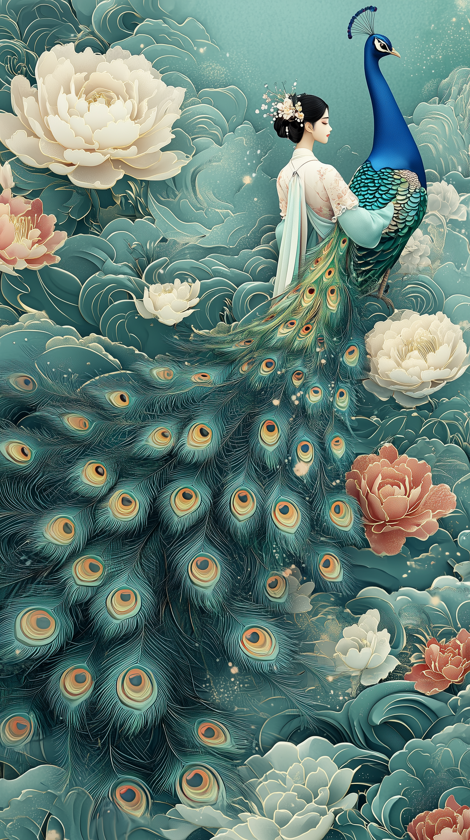 极简主义,3D立体,美女与孔雀开屏设计,尾羽无限延伸至画面外。新中式风格图形设计,撞色干净背景,先锋艺术,大胆配色,禅意构图,干净画面,重构版面,古典花草纹理内凹凸风格,丢失中部图形表面结构,素雅色系渐变荧光墨水系统,花朵幻觉,模块化空白,渐变蓝色光谱印刷元素,田园元素幽灵 ,丁达尔效应。
