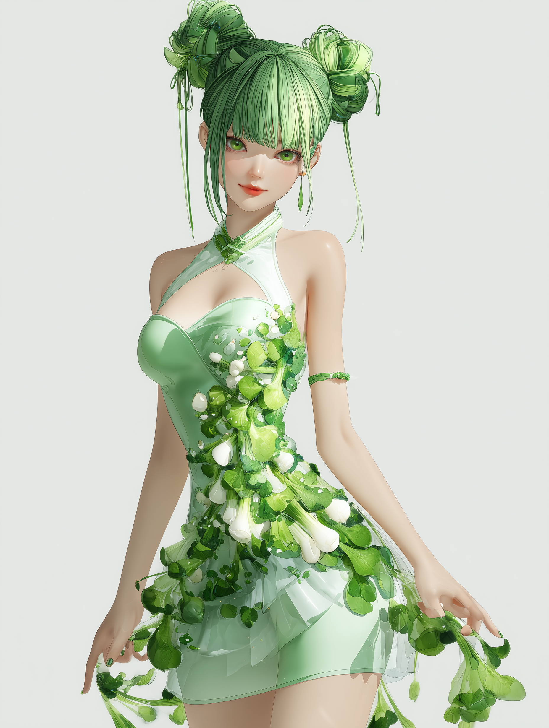 以3D卡通渲染,塑造出清新且时尚的氛围。拟人化的葱,呈现为一位身姿轻盈的少女。 她拥有一头如葱叶般鲜绿的长发,柔顺亮泽,编成多股麻花辫垂落在双肩与后背,发间点缀着细碎的白色葱花与鲜嫩葱叶,宛如星辰与绿叶交织。少女肤色白皙,泛着淡淡的绿韵,双眸如翡翠般明亮。 少女身着葱主题连衣裙。上身紧身,淡绿色雪纺面料贴合身形,领口与袖口用白色丝线绣着葱的脉络图案,精致入微。裙摆由层层叠叠的葱叶紧密排列拼接而成,从浅绿到深绿自然过渡,葱叶脉络清晰,随风摆动,充满生机。裙子腰间系着一条白色宽腰带,搭配绿色葱形扣子,凸显纤细腰肢。她脚穿一双淡绿色高跟鞋,鞋面上镶嵌着白色葱花形状的水钻,鞋跟处缠绕着几圈葱叶,时尚感十足。 场景为时尚秀场T台,T台是透明玻璃质地,下方透出淡绿色光晕,仿若梦幻舞台。背景中,多束聚光灯散发出柔和的白绿交织光线,营造出清新氛围,台下模糊的观众身影营造出热闹秀场感。画面整体风格流畅自然、质感细腻,全景聚焦少女全身正面,完美融合葱的清新与时尚魅力