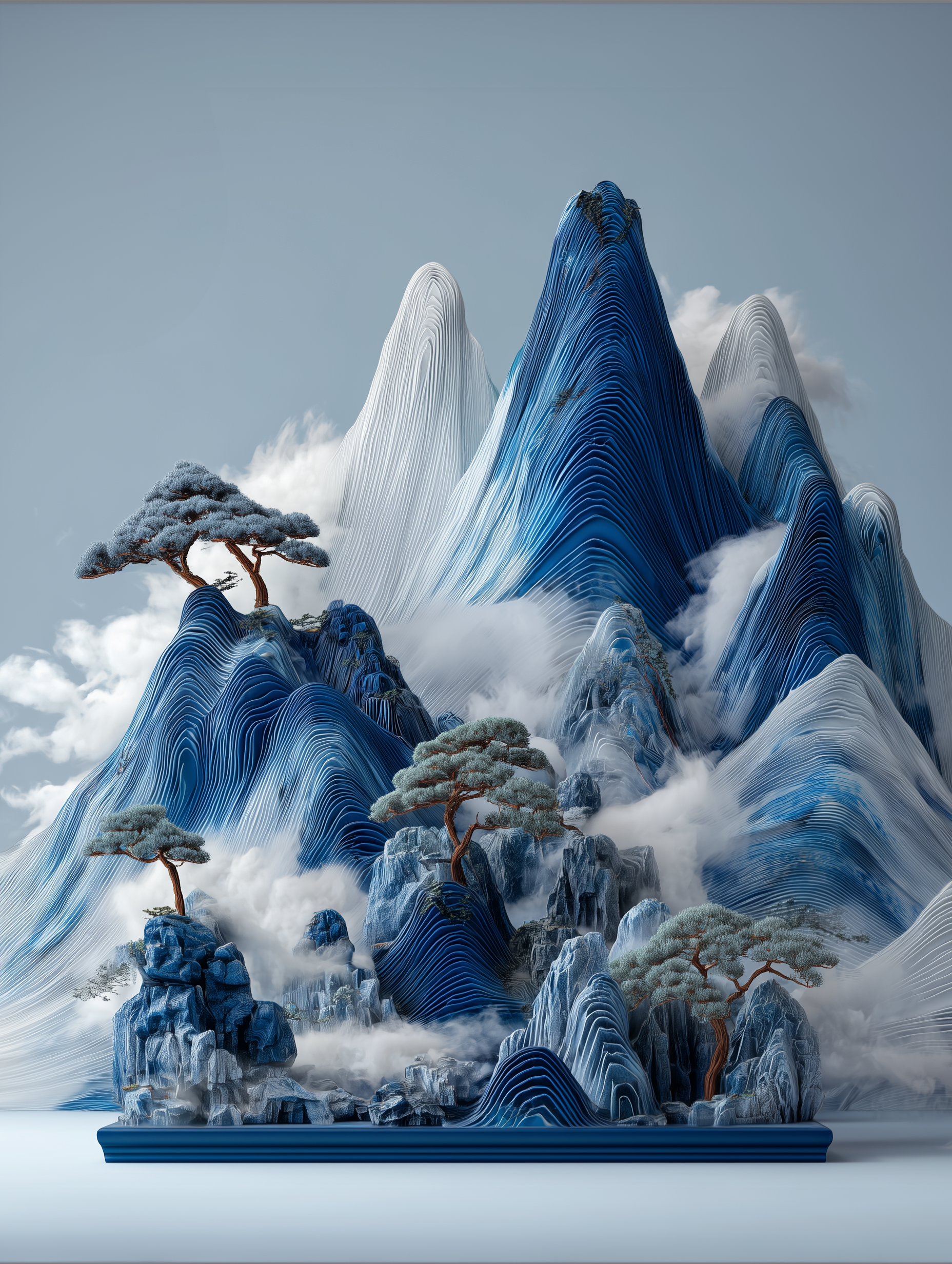 打造新中式山水意境的立体景观。玉质材料绘有淡蓝色水墨山水图案,与下方真实的山水景观相呼应。下方以蓝白色调呈现层叠的山峦,山峰有细腻的纹理与积雪质感,山间云雾缭绕,增添空灵氛围。点缀着造型古朴的松树,松针如霜覆盖,还有小型瀑布、岩石等元素,整体风格融合传统水墨山水与现代微景观艺术,通过瓷瓶与真实山水的虚实结合,营造出典雅、悠远的东方意境 。 色彩以蓝、白、灰为主,搭配少量绿色,呈现出清冷、宁静的色调。氛围上传递出冬日山水的静谧与悠远,仿佛一幅立体的水墨画卷,让人感受东方美学中 “留白”“意境” 的独特魅力 。