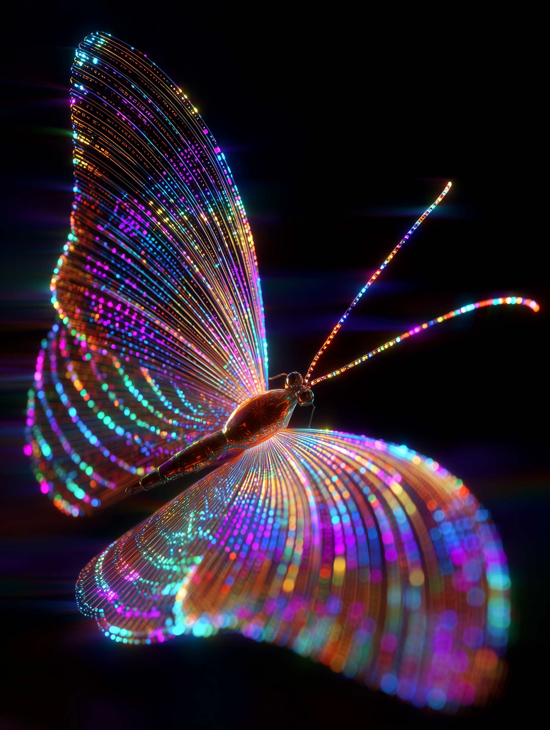 8K的发光蝴蝶群从中央光核爆发,翅膀反射出霓虹色的光谱,每一个都携带二进制代码片段,在黑色区域上旋转成漩涡