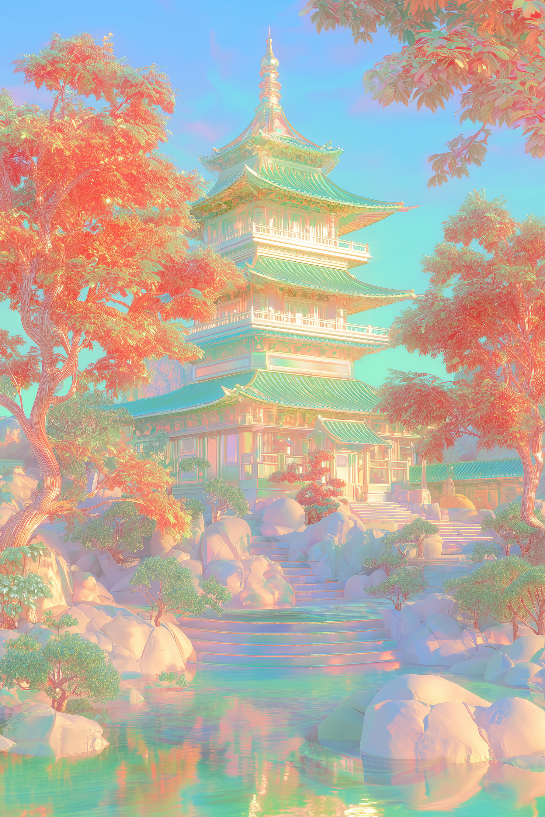 这是一个金属制造的舞台布景,中国传统的银色金属多层宝塔,绿色琉璃瓦和复杂的金属雕刻,周围是超现实的银色金属制作的树木,充满活力的橙色火红的叶子,反射池塘,光滑的银色的金属圆形石头结构,柔和的黄金时刻阳光投下温暖的光芒和柔和的阴影,银色金属感的未来主义风格,树干上银色金属光泽的超细节纹理,电影般的灯光,梦幻般的氛围,对称的构图,柔和的调色板,高对比度的橙绿色调。超逼真的8K分辨率,没有人,幻想的建筑,空灵的环境